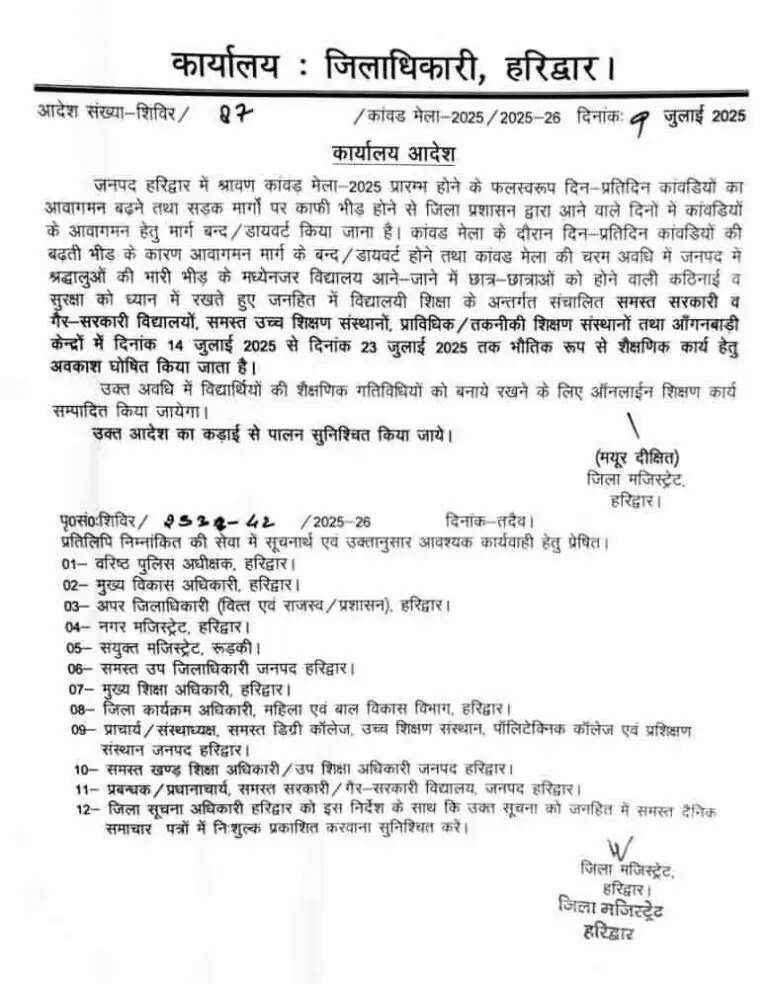 जिलाधिकारी कार्यालय द्वारा जारी आदेश में कहा गया है कि जनपद हरिद्वार में श्रवण कांवड़ मेला 2025 प्रारम्भ होने के फलस्वरूप दिन-प्रतिदिन कांवड़ियों का आवागमन बढ़ने तथा सड़क मार्गों पर काफी भीड़ होने से जिला प्रशासन द्वारा आने वाले दिनों में कांवडियों के आवागमन हेतु मार्ग बन्द डायवर्ट किया जाना है। जिस कारण विद्यालय आने-जाने में छात्र-छात्राओं को होने वाली कठिनाई व सुरक्षा को ध्यान में रखते हुए जनहित में विद्यालयी शिक्षा के अन्तर्गत संचालित समस्त सरकारी व गैर-सरकारी विद्यालयों, समस्त उच्च शिक्षण संस्थानों, प्राविधिक / तकनीकी शिक्षण संस्थानों तथा आँगनबाड़ी केन्द्रों में दिनांक 14 जुलाई 2025 से दिनांक 23 जुलाई 2025 तक अवकाश घोषित किया जाता है। उक्त अवधि में विद्यार्थियों की शैक्षणिक गतिविधियों को बनाये रखने के लिए ऑनलाईन शिक्षण कार्य सम्पादित किया जायेगा।